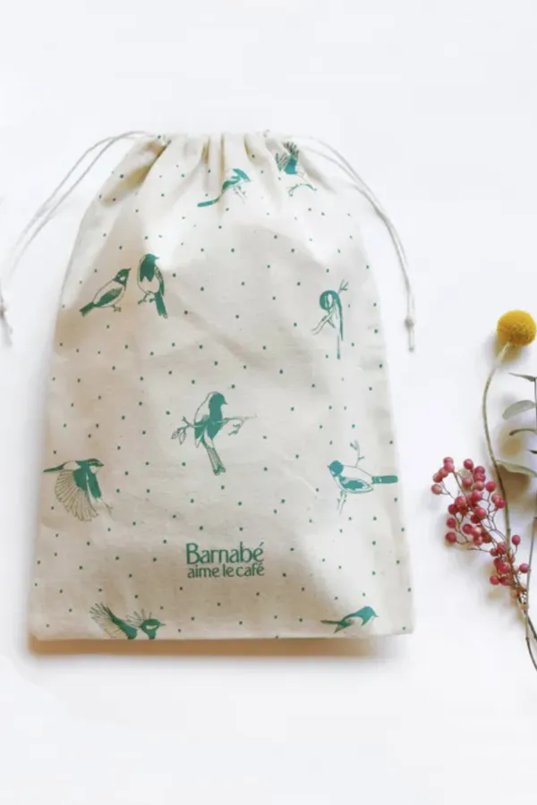 Emballage cadeauPapier de soie & pochon oiseaux en coton