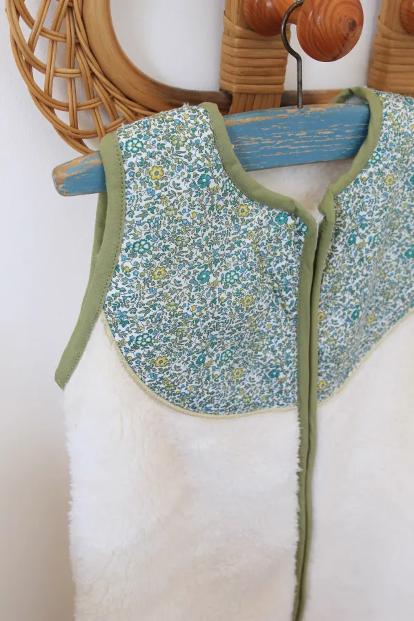 Très belle gigoteuse en laine polaire ultra douce et moelleuse polyester certifié Oeko-tex® avec son plastron chic en tissu Liberty® gansé d'un passepoil or.