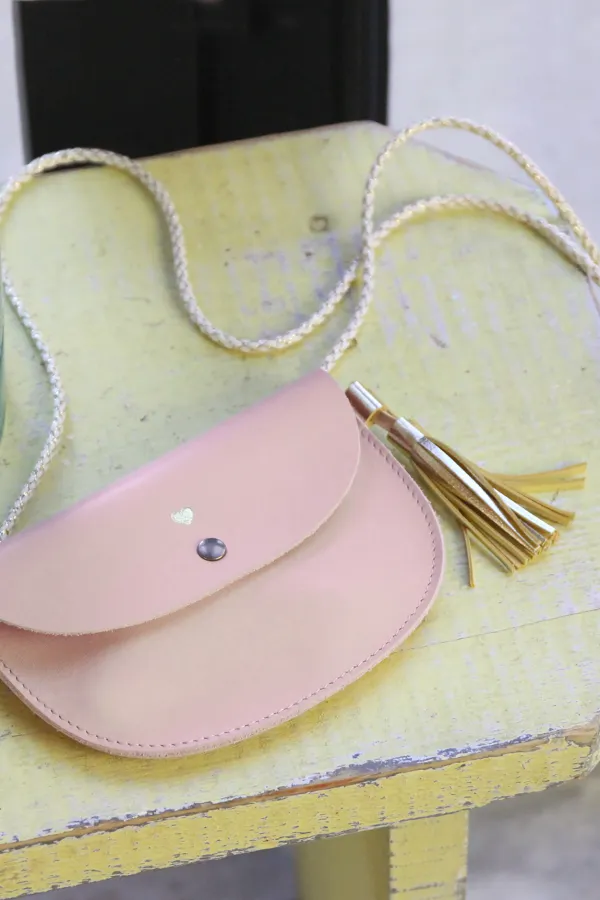Une jolie pièce made in France en cuir pleine fleur au toucher agneau et sa cordelette tressée croisillons doré. Il est orné d'un joli pompon en cuir et d'un marquage coeur à chaud doré.
