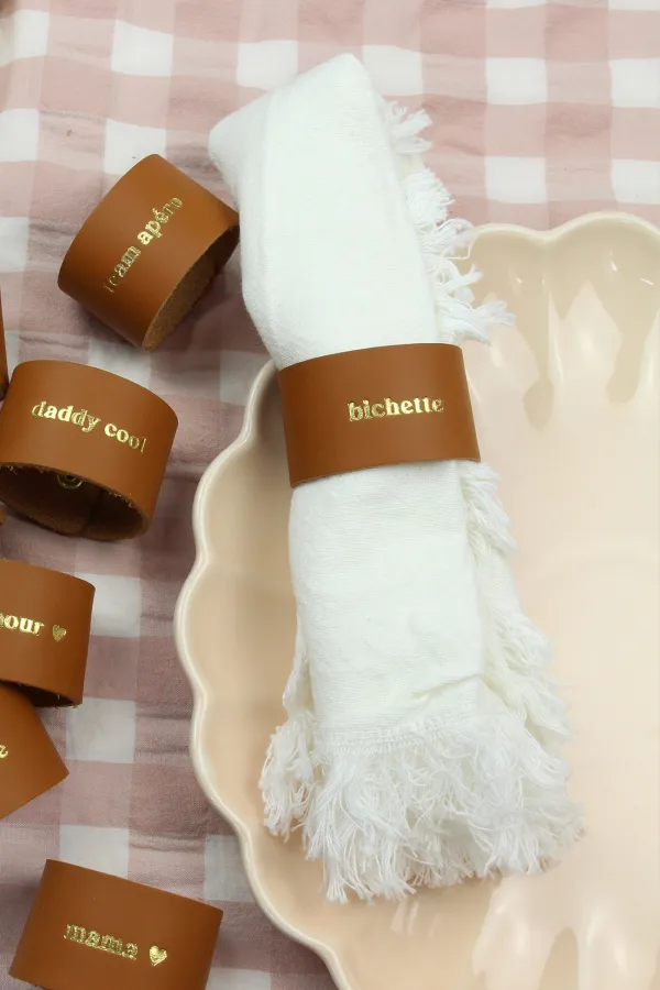 Craquez pour les ronds de serviette en cuir au style chic gravés d'un petit texte charmant. ils apporteront LA touche d'originalité et de personnalité à vos tables tout en permettant à chaque convive de retrouver facilement sa serviette de table pour le repas suivant.