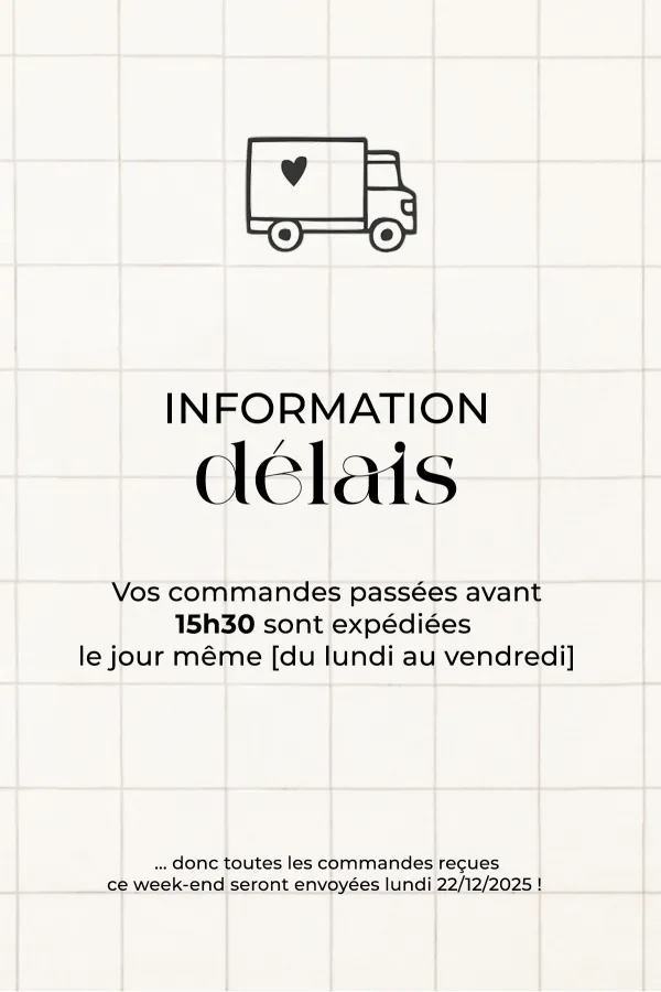 Vos commandes passées et payées avant 13 heures sont déposées à la poste le jour même, du lundi au vendredi (hors congés et jours fériés). Livraison entre 48 et 72 heures (expédition standard en Colissimo suivi).
