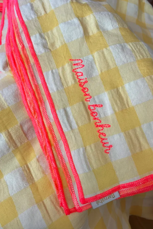 Apportez LA touche d'originalité Barnabé aime le café avec notre nappe à carreaux en tissu coton vichy seersucker à l'aspect très légèrement gauffré. Son petit plus : le surjet contrasté qui la borde et la broderie "bon appétit" !